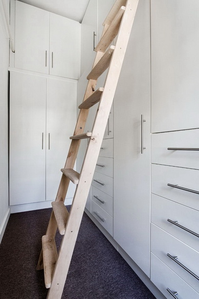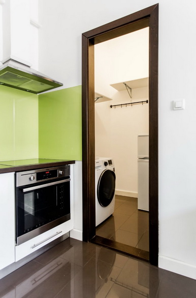 Belépve az előtérbe érkezünk, szemben található az étkezős konyha és a háztartási helyiség. Jobbra gardróbszoba, balra pedig a közlekedő vezet a nappaliba, amelyből a hálót alakították ki. Innen nyílik a fürdőszoba, melyben kád és zuhanyzó is van. A WC külön helyiségben található, kézmosóval.