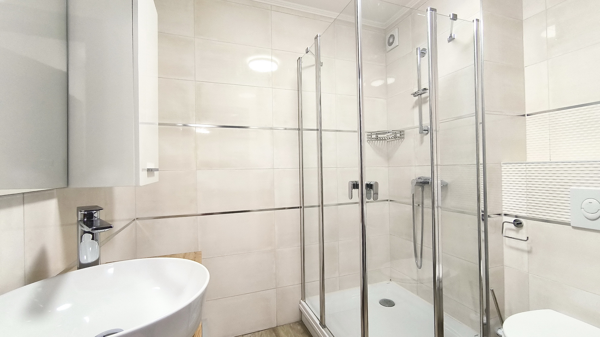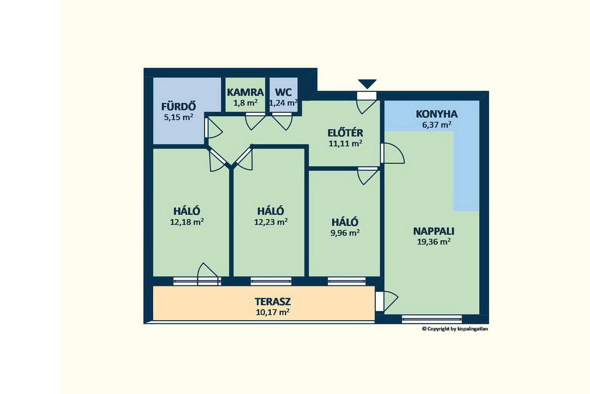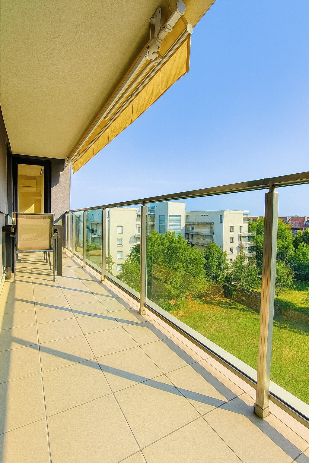 A tulajdoni lapon 79 nm, de valóságban 84 nm-es lakás a társasház 5. emeletén található, melyet lifttel közelíthetünk meg. A bejárati ajtón belépve az előszobába érkezünk. Balra a teraszkapcsolatos nappalis konyha található. Jobbra haladva egymás mellett három külön nyíló hálószoba kapott helyet, melyek közül az utolsó szintén teraszkapcsolattal rendelkezik. A szobákkal szemben az előtérből nyílik a fürdő és a gardrób, illetve egy külön wc kézmosóval. Az ingatlan frissen festett, több beépített szekrény segíti a tárolást. Azonnal birtokba vehető!