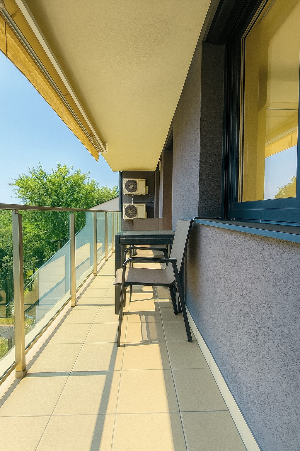 A fűtést és a meleg vizet házközponti kazán biztosítja. A kellemes belső hőmérsékletről klímaberendezés gondoskodik minden szobában, az ablakok redőnnyel szereltek.