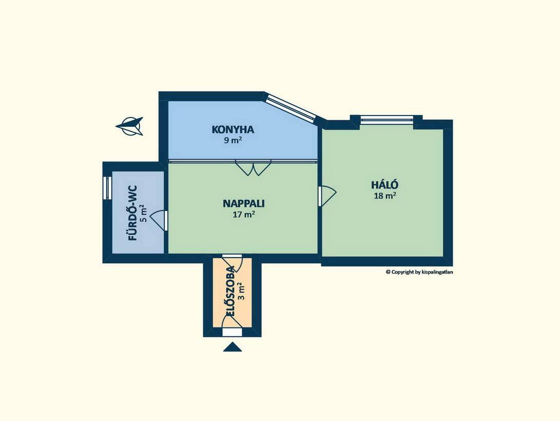 Bal oldalon a kádas fürdőszoba, jobb oldalon a hálószoba kapott helyet. A lakás keleti tájolású, így a délelőtti órákban a legvilágosabb, az utcai zaj nem szűrődik be az ingatlanba.