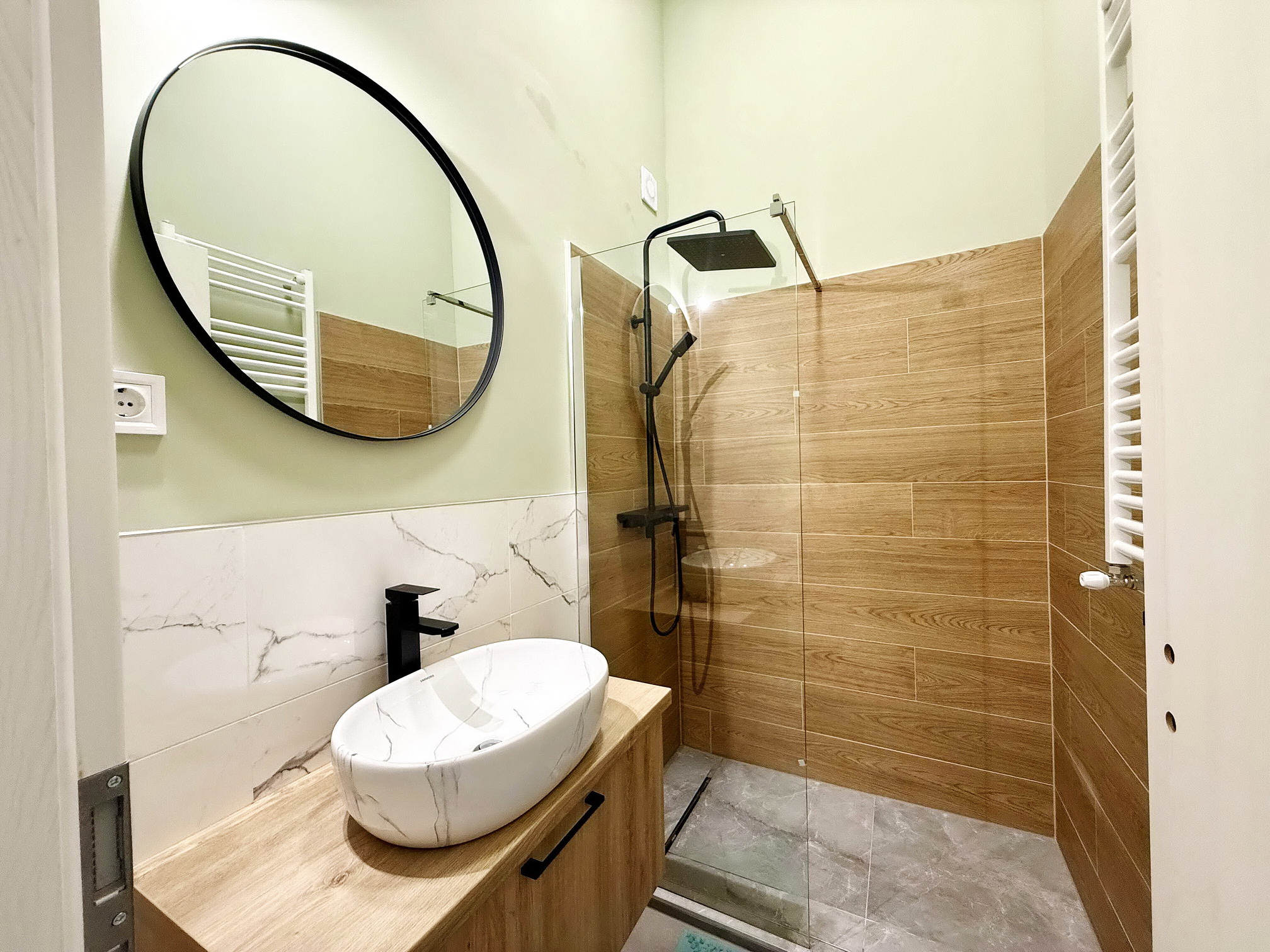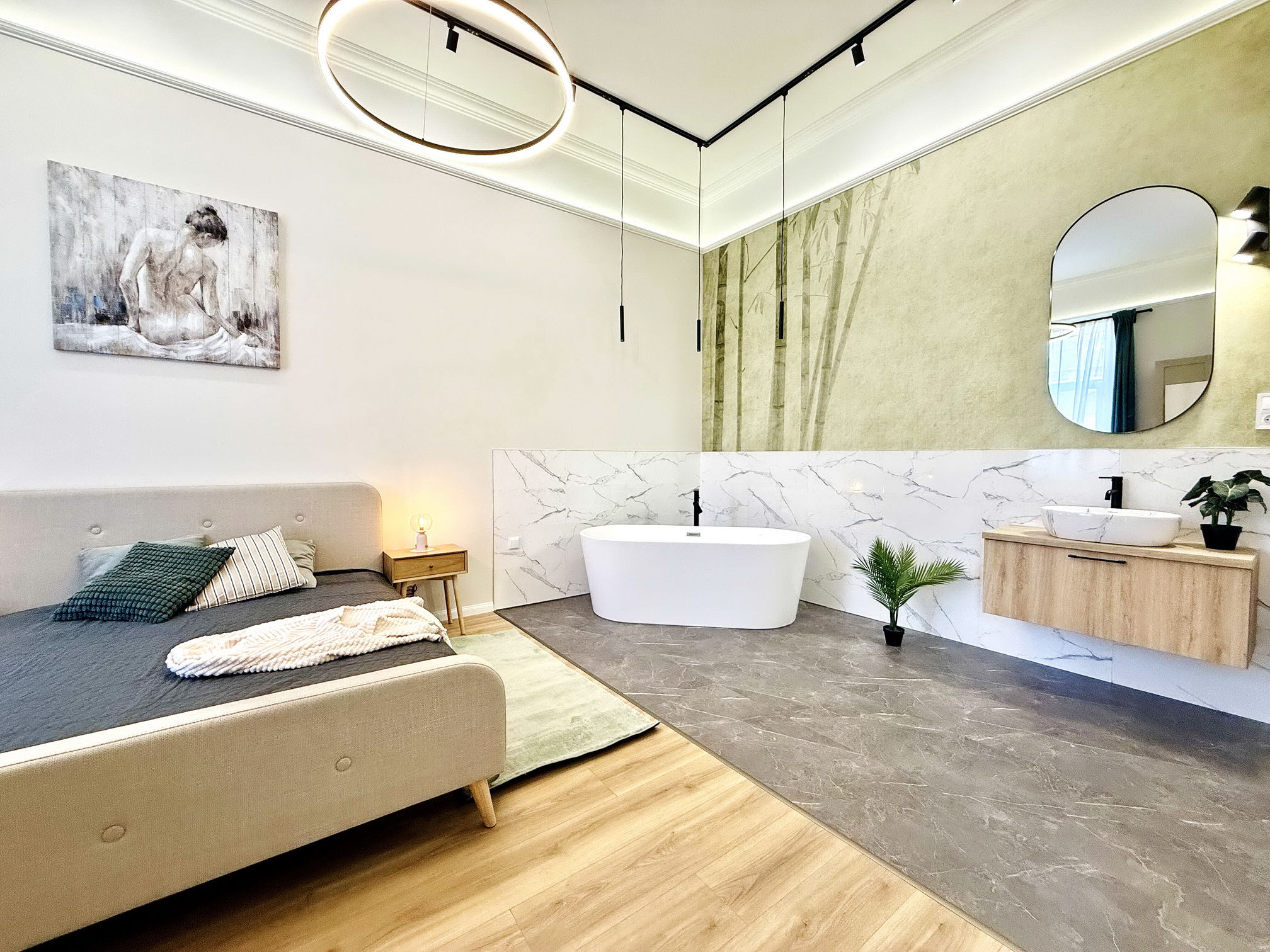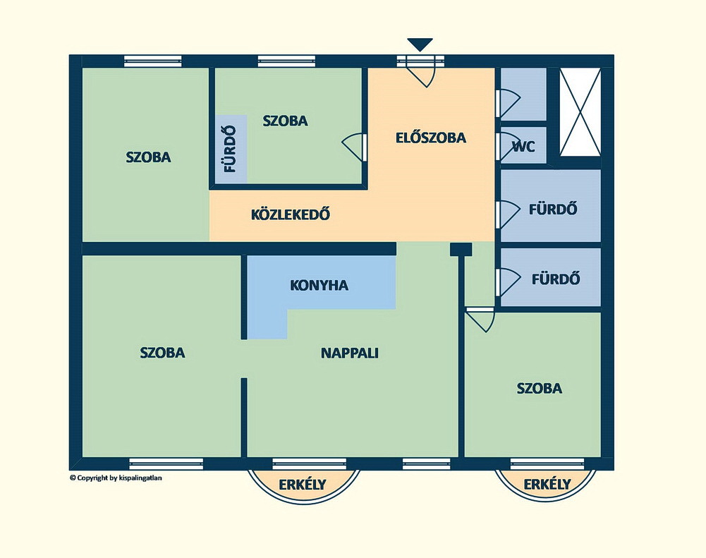 A 121 nm-es, dupla komfortos lakás a társasház harmadik emeletén található, amit gyalogosan vagy lifttel közelíthetünk meg. A bejárati ajtón belépve az előszobába lépünk. Balra két fürdő és a külön WC található. Jobbra a saját fürdővel rendelkező hálószoba nyílik, mellette szintén kialakítottak hálószobát. A bejárattal szemben a nappalis konyha, az abból nyíló háló és egy külön nyíló hálószoba kapott helyet. A lakás teljes felújításon és átépítésen esett át, melyet igényes anyagfelhasználás és kivitelezés követett. Azonnal költözhető!